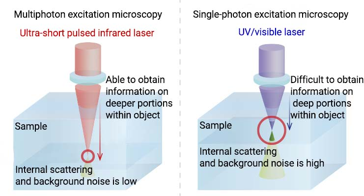 共同荧光测定中激发光的波长短于荧光波长。然而,多光子光谱仪在近红外区域使用波长长于荧光波长的激发光。由于近红外光比可见光更容易通过物体,因此它可以提供关于物体内深层部分的信息,并且还可以减少物体内部的散射和背景噪声的影响。此外,近红外光的能量低于可见光和紫外光,从而最大限度地减少对细胞的损害。