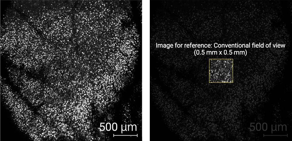 到目前为止,用双光子显微镜观测到的视野仅限于约 0.25 mm2 的极小面积。这种非常狭窄的视野阻止了同时观察多个脑区域的神经细胞,即使在观察小鼠等小动物时也是如此。