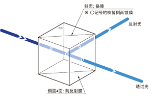 注意 | ▶铬膜有40%左右的吸收,透过光和反射光只能各自获得入射光量的30%左右。 ▶ 请从有○记号的棱镜侧面射入光。从棱镜相反侧面入射时,反射率或分束比,偏光特性可能会改变。 ▶使用激光等的直线偏光时,反射率或透过率随偏光方向变化。如果要调整分束比为1:1时,请45°倾斜偏光方向或使用圆偏光。 ▶入射光的相位差在透过光,反射光中不能保持不变。请利用波长板补偿相位差。 ▶由于材料的折射率和玻璃厚度的影响,透过光或反射光会发生波长分散。而且,在收缩或发散的入射光线中使用后,可能产生色差或球差。 | ||||||||||||||||||||||||