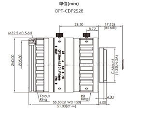 全视场分辨率208lp/mm,适用于像元尺寸2.4μm及以上,芯片尺寸≤1.1”(Ø17.6mm)的相机。