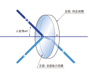 注意 | ▶使用激光等的直线偏光时,反射率或透过率随偏光方向变化。如果要调整分束比为1:1时,请45°倾斜偏光方向或使用圆偏光。 ▶由于基板的折射率和厚度的作用,透过光的光路相对于入射光会平行移动数mm。(楔型半反射镜在平行移动的同时光束大约偏角30分) ▶用于45°之外的入射角时,透过率波长特性将产生变化。 ▶不能辨别反射镀膜面位置时,请使用基板侧面的箭头符号确认。 ▶入射光的相位差在透过光,反射光中不能保持不变。请利用波长板补偿相位差。 | ||||||||||||||||||||||||||